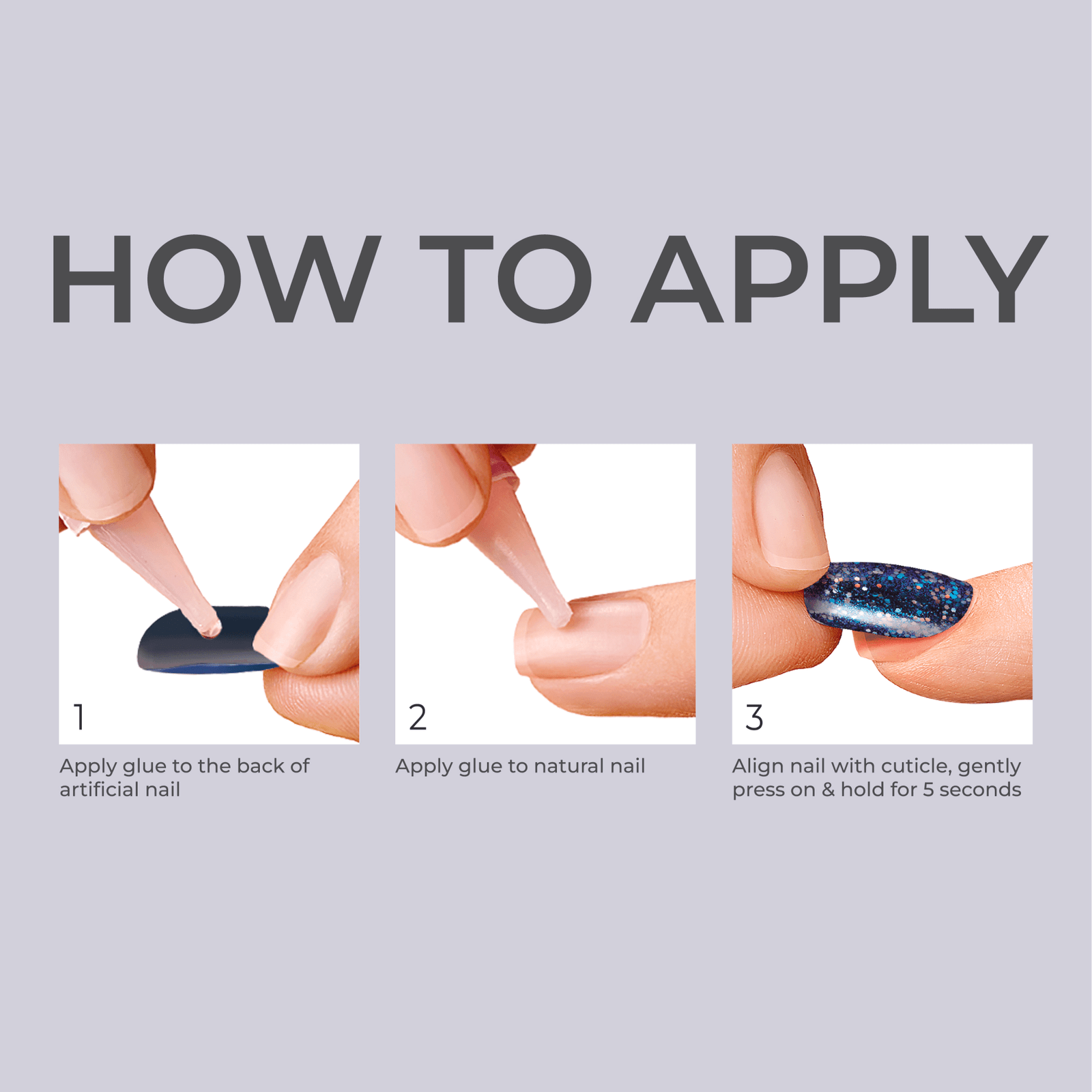 - APPLY If using adhesive tabs, match adhesive tab size with nail. Peel c lear backing off the tab. Apply adhesive tab to the natural nail then you can properly line up the artificial nail. Press down artificial nail on natural nail, in the center and at both sides at the same time. Press firmly and hold for at least 30 seconds If using the glue, apply an even layer of glue to natural nail and artificial nail. Press and hold for at least 30 seconds with even pressure to entire nail to secure adhesion. For best wear: Press nails down several times and avoid contact with water for the first hour.