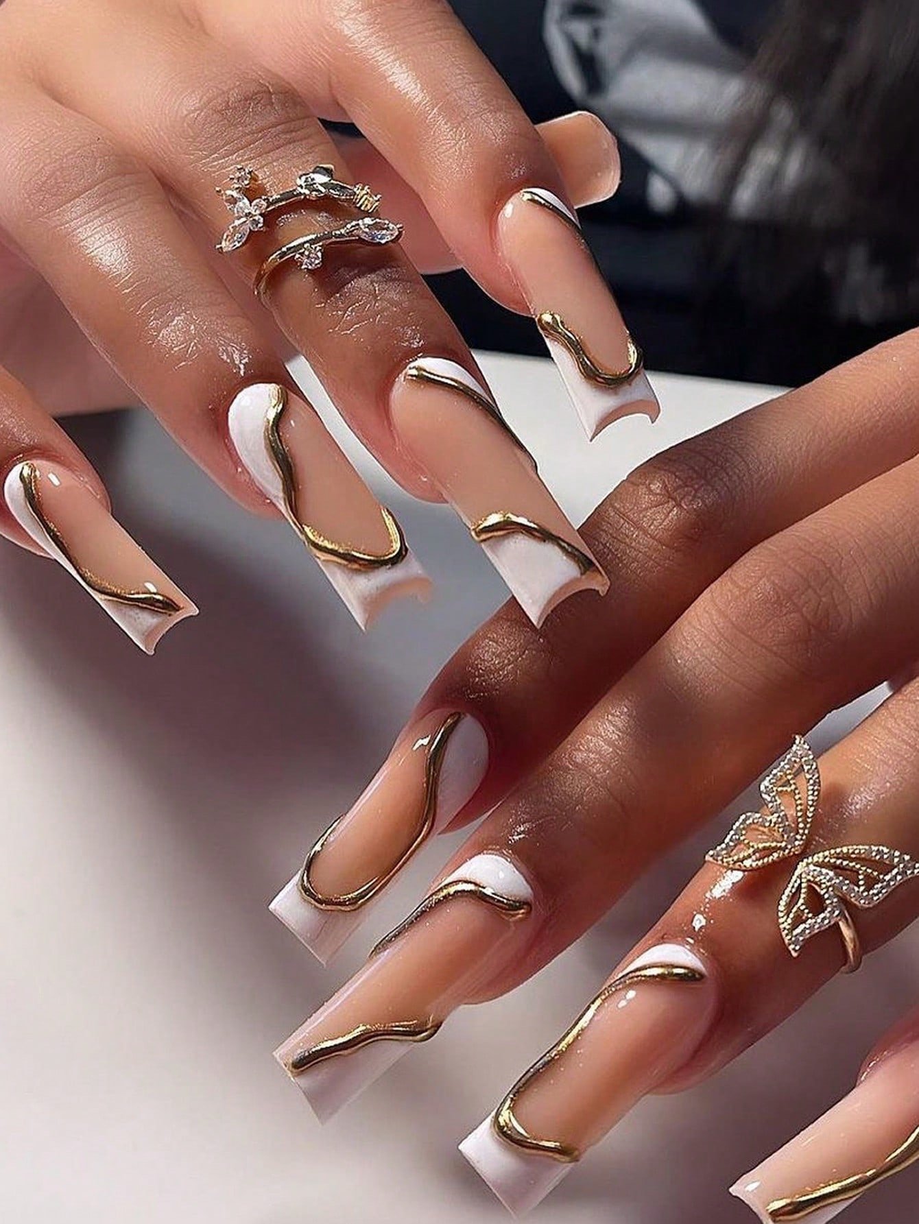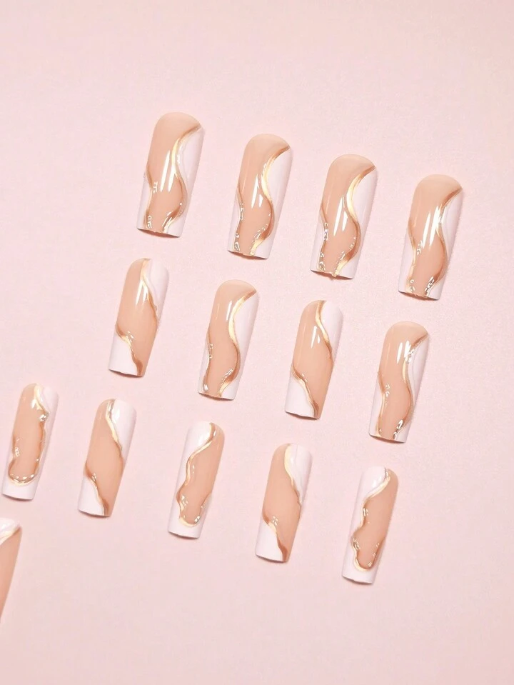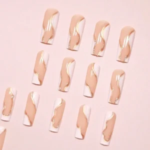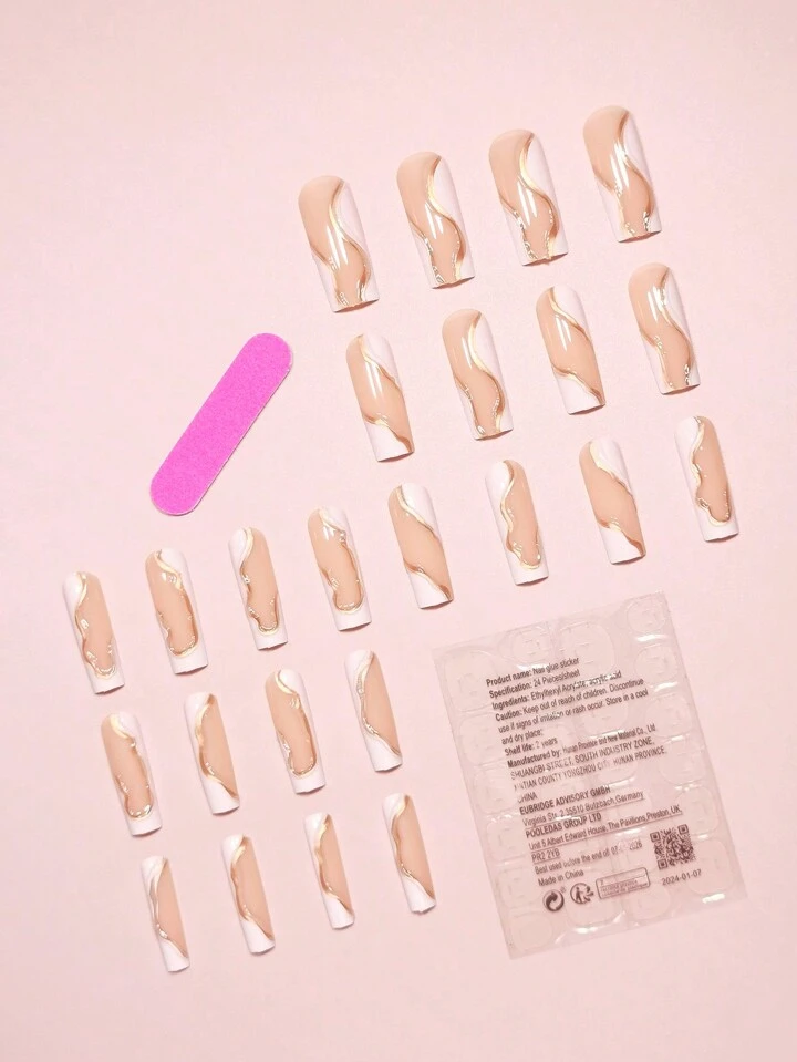 Upgrade your manicure with our 24-Piece Nordic Long Square Press-On Nails, featuring a stunning blend of white, nude, and gold in a French stripe design with 3D acrylic details. These elegant and versatile nails are perfect for everyday wear or special occasions, delivering a salon-quality look in minutes.